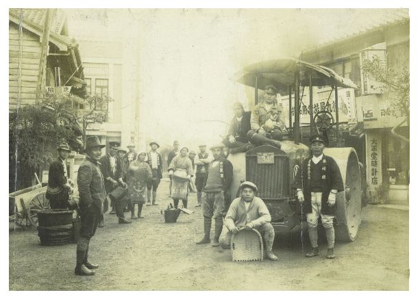 左手一番手前が創業者の星野兼平、右の重機ローラーに乗って犬を抱いているのが2代目社長星野國盛です。